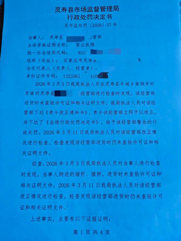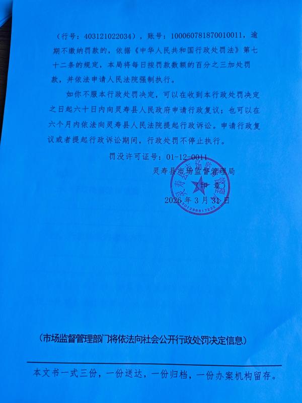 灵寿县市场监督管理局行政处罚公示灵市监处罚(2026)37号