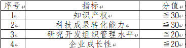 企业创新能力主要从知识产权、科技成果转化能力、研究开发组织管理水平、企业成长性等四项指标进行评价。各级指标均按整数打分,满分为100分,综合得分达到70分以上(不含70分)为符合认定要求。四项指标分值结构详见下表: