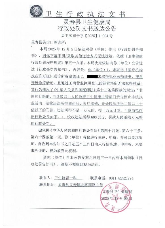 灵寿县美齿口腔诊所行政处罚文书送达公告