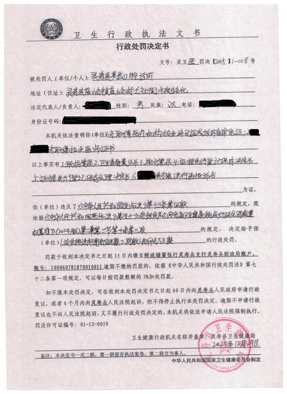 灵寿县卫生健康局行政处罚决定书灵卫医罚决【2025】1-008号