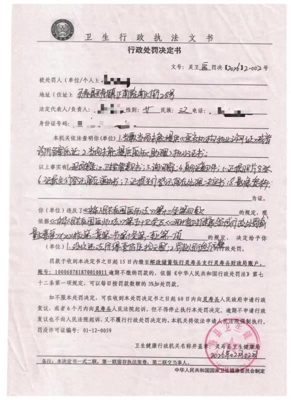 灵寿县卫生健康局行政处罚决定书灵卫医罚决【2026】2-002