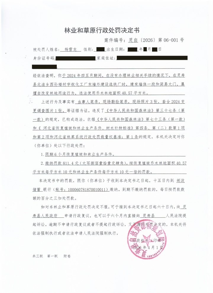 灵寿县林业和草原行政处罚决定书案件编号:灵自[2026]第06-001号