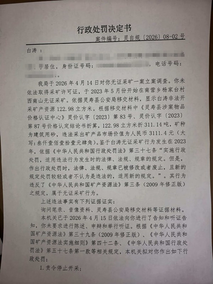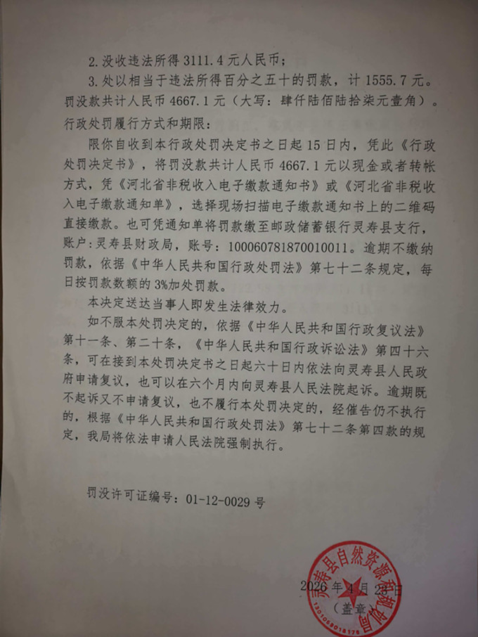 灵寿县行政处罚决定书案件编号:灵自规(2026)第08-02号