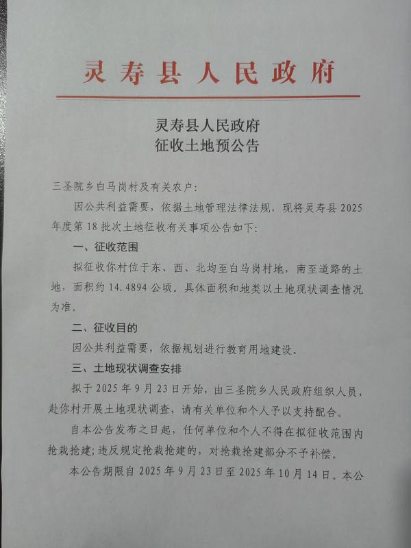 灵寿县2025年度第18批次三圣院乡白马岗村征收土地预公告