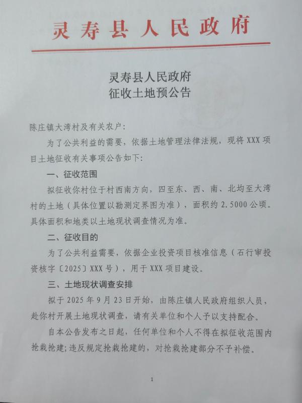 灵寿县XXX项目陈庄镇大湾村征收土地预公告