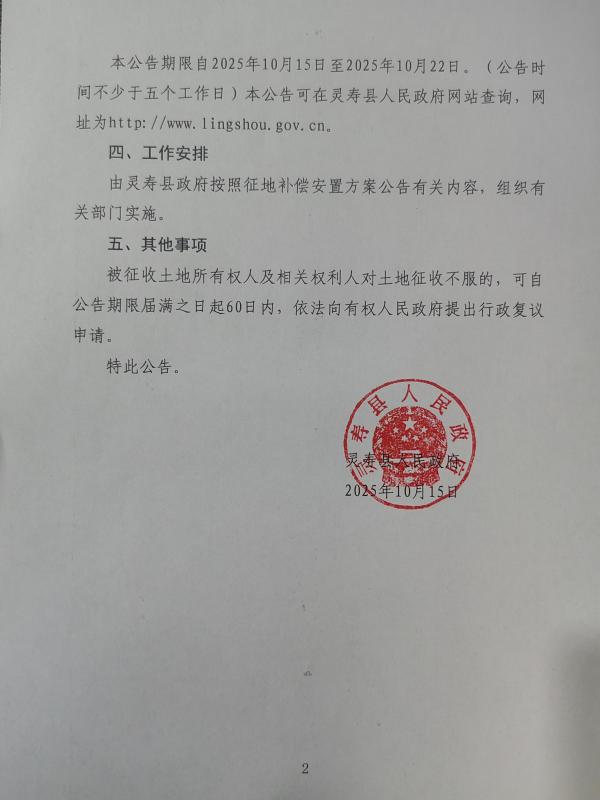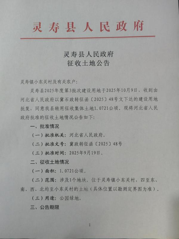 关于灵寿县2025年第3批次灵寿镇小东关村征收土地公告