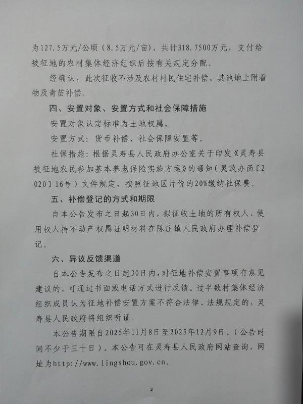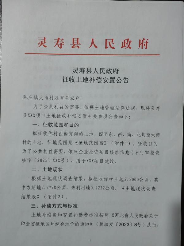 关于灵寿县XXX项目陈庄镇大湾村征收土地补偿安置公告
