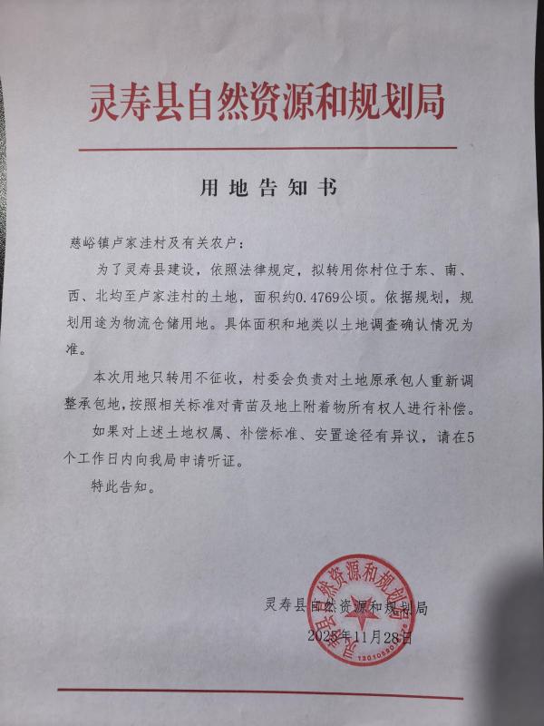 关于慈峪镇卢家洼村用地告知书
