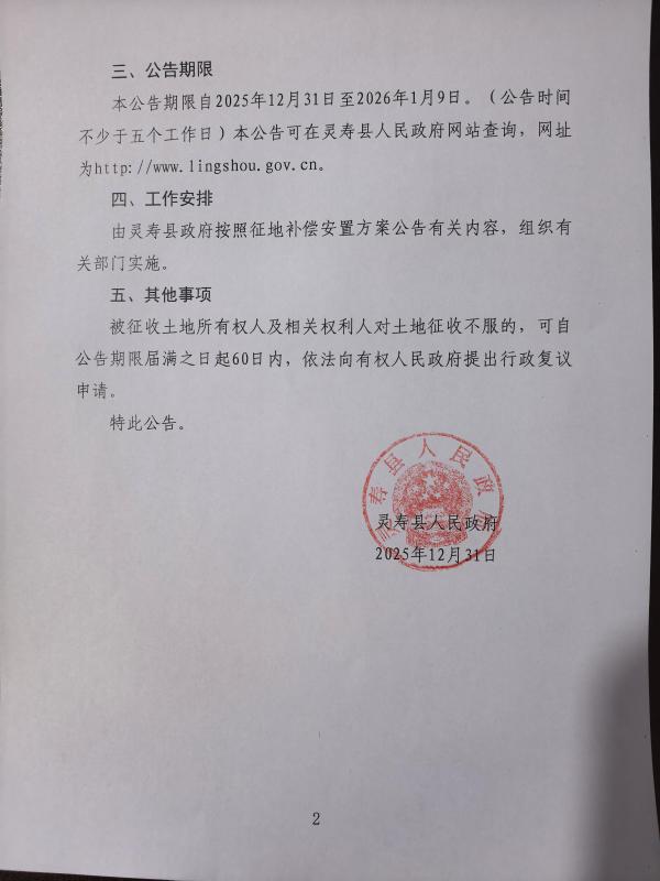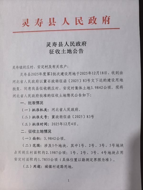 关于灵寿县2025年第2批次灵寿镇胡庄村、安定村征收土地公告