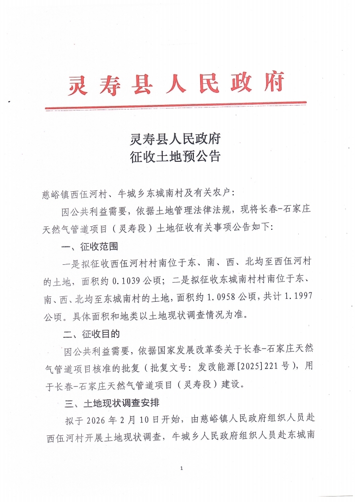 关于长春-石家庄天然气管道项目(灵寿段)慈峪镇西伍河村、牛城乡东城南村征收土地预公告