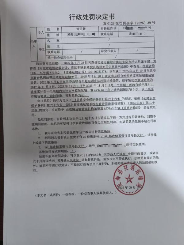 灵寿县交通运输局行政处罚决定书冀0126交罚罚决字〔2025〕39号