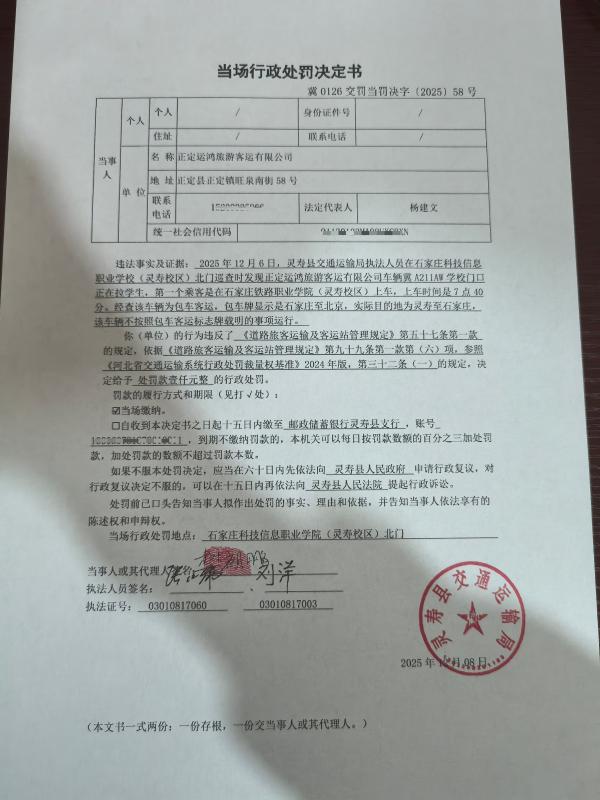 灵寿县交通运输局当场行政处罚决定书冀0126交罚当罚决字〔2025〕58号