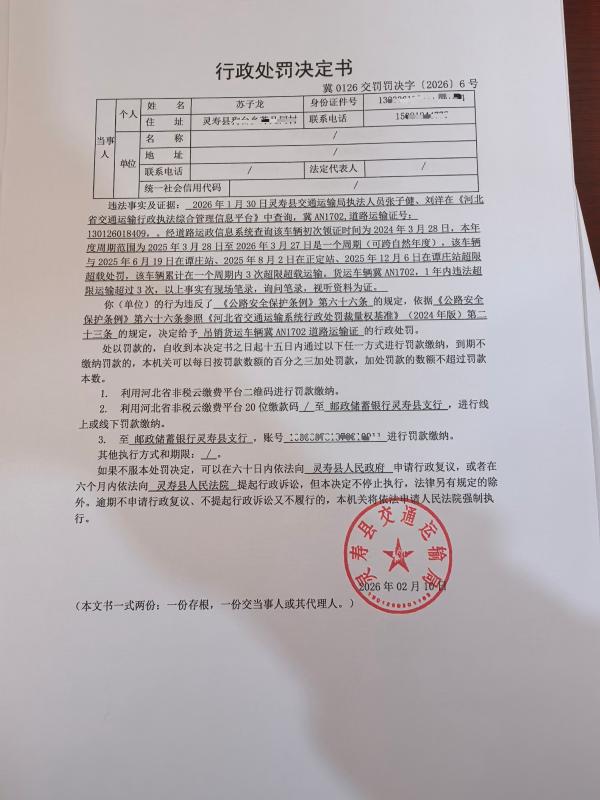 灵寿县交通运输局行政处罚决定书冀0126交罚罚决字〔2026〕6号