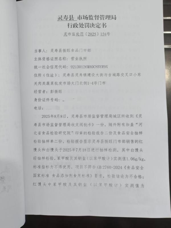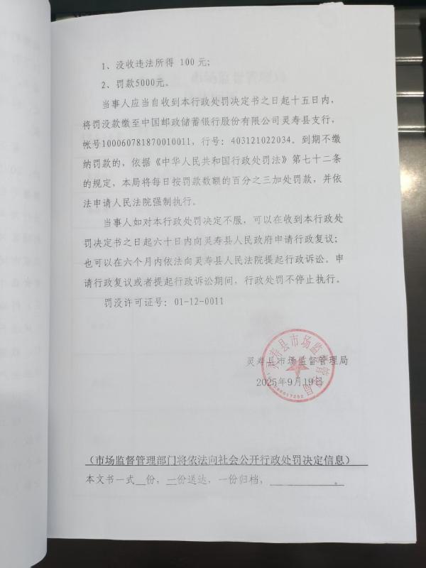 灵寿县市场监督管理局行政处罚公示灵市监处罚【2025】156号
