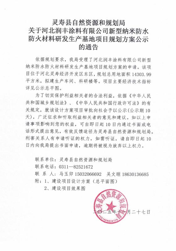 关于河北润丰涂料有限公司新型纳米防水防火材料研发生产基地项目规划方案公示的通告