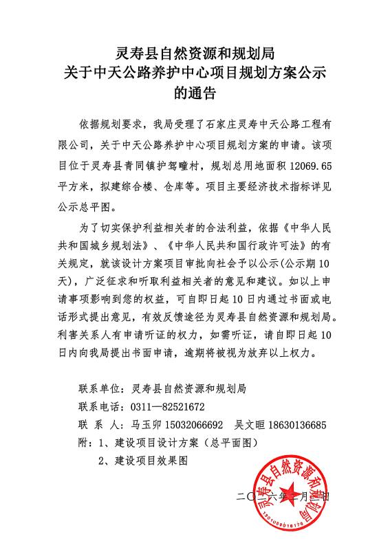 关于中天公路养护中心项目规划方案公示的通告