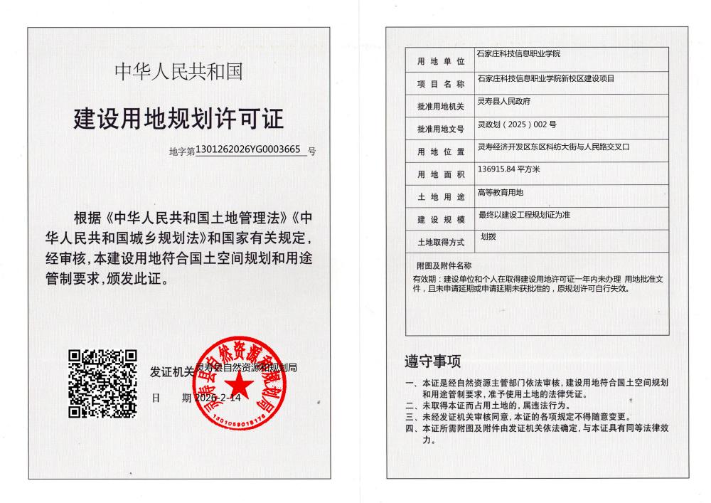 石家庄科技信息职业学院新校区建设项目建设用地规划许可证