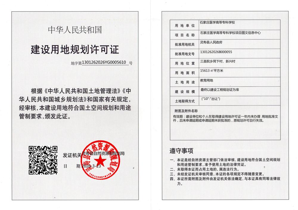 石家庄医学高等专科学校项目图文信息中心建设用地规划许可证