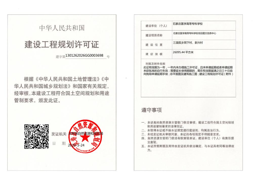石家庄医学高等专科学校项目图文信息中心建设工程规划许可证