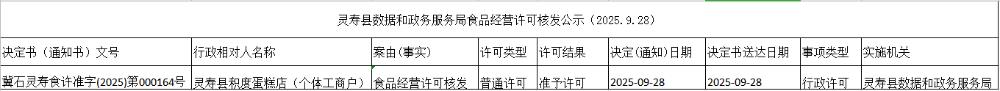 灵寿县数据和政务服务局食品经营许可核发公示(2025.9.28)