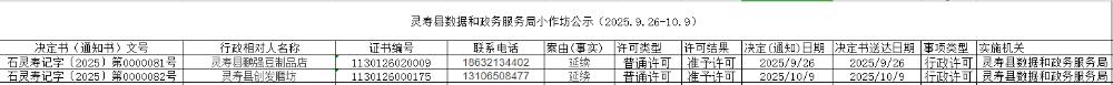 灵寿县数据和政务服务局小作坊公示(2025.9.26-10.9)