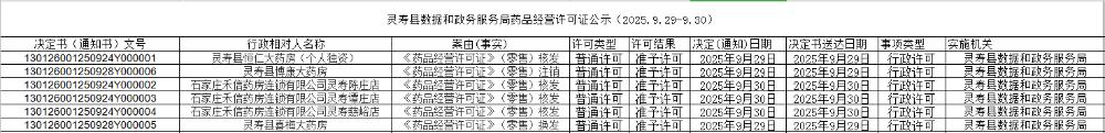 灵寿县数据和政务服务局药品经营许可证公示(2025.9.29-9.30)