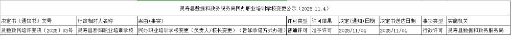灵寿县数据和政务服务局民办职业培训学校变更公示(2025.11.4)
