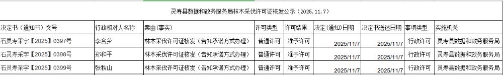 灵寿县数据和政务服务局林木采伐许可证核发公示(2025.11.7)