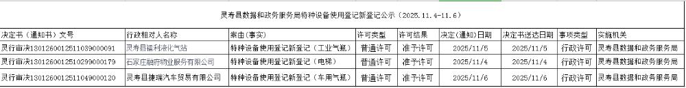 灵寿县数据和政务服务局特种设备使用登记新登记公示(2025.11.4-11.6)