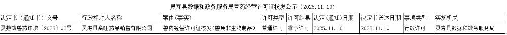 灵寿县数据和政务服务局兽药经营许可证核发公示(2025.11.10)