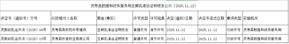 灵寿县数据和政务服务局生鲜乳准运证明核发公示(2025.11.12)