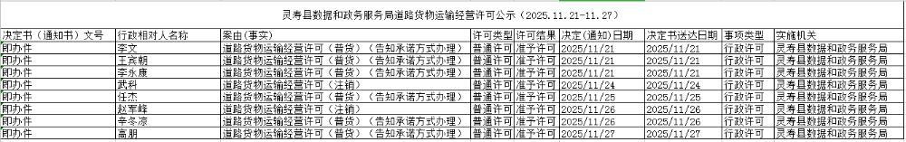 灵寿县数据和政务服务局道路货物运输经营许可公示(2025.11.21-11.27)