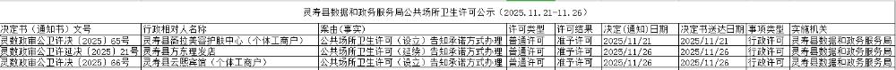 灵寿县数据和政务服务局公共场所卫生许可公示(2025.11.21-11.26)