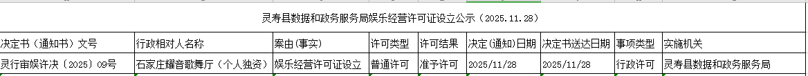 灵寿县数据和政务服务局娱乐经营许可证设立公示(2025.11.28)
