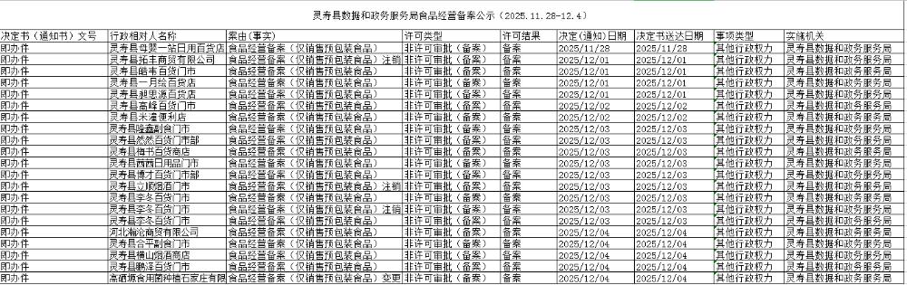 灵寿县数据和政务服务局食品经营备案公示(2025.11.28-12.4)