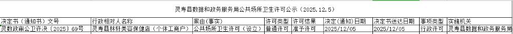 灵寿县数据和政务服务局公共场所卫生许可公示(2025.12.5)
