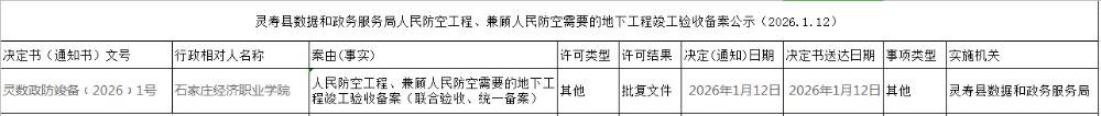 灵寿县数据和政务服务局人民防空工程、兼顾人民防空需要的地下工程竣工验收备案公示(2026.1.12)