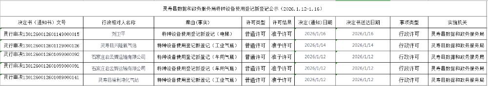 灵寿县数据和政务服务局特种设备使用登记新登记公示(2026.1.12-1.16)