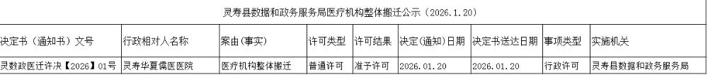 灵寿县数据和政务服务局医疗机构整体搬迁公示(2026.1.20)