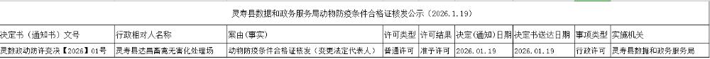 灵寿县数据和政务服务局动物防疫条件合格证核发公示(2026.1.19)