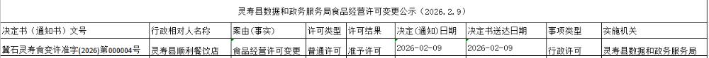 灵寿县数据和政务服务局食品经营许可变更公示(2026.2.9)