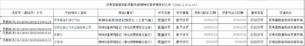 灵寿县数据和政务服务局特种设备使用登记公示(2026.2.9-2.13)
