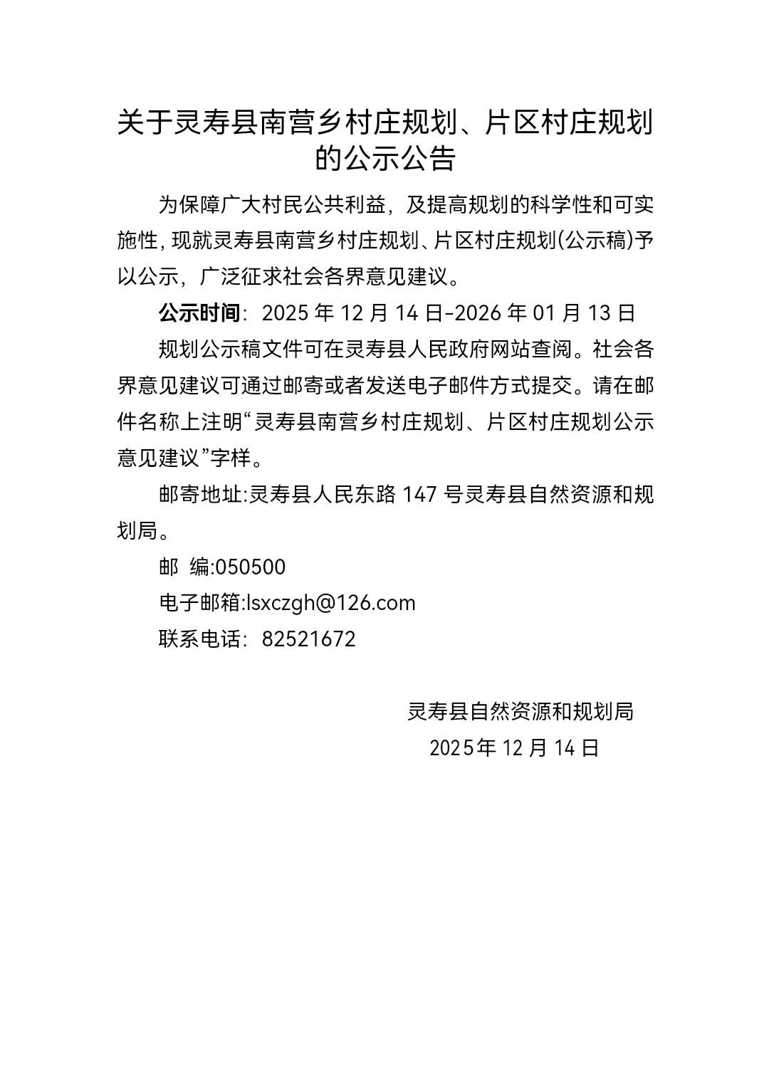 关于灵寿县南营乡村庄规划、片区村庄规划的公示公告(征求意见)