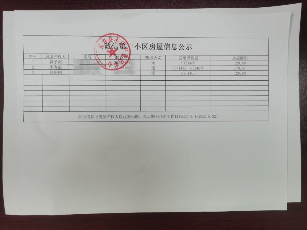 诚信第一小区房屋信息公示