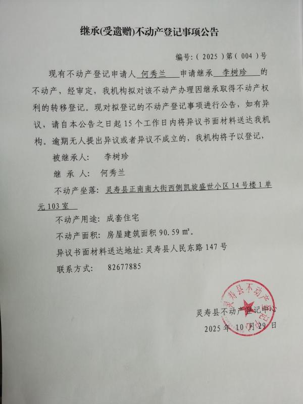 继承(受遗赠)不动产登记事项公告编号:(2025)第(004)号