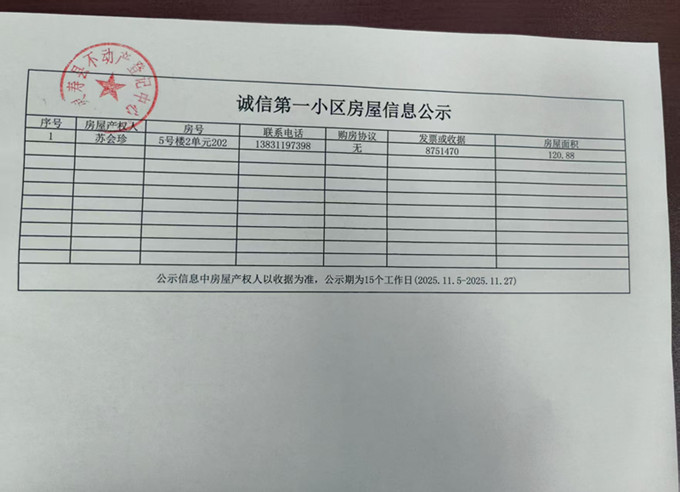诚信第一小区房屋信息公示