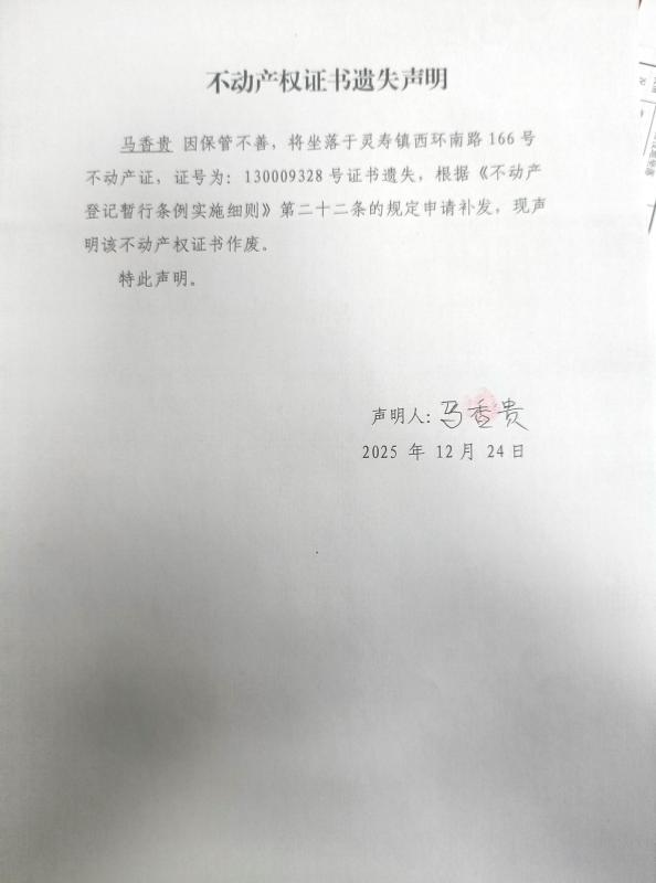 马香贵不动产权证书遗失声明