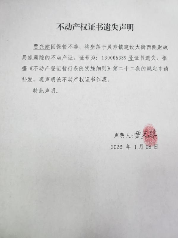 贾兴建不动产权证书遗失声明(证号为:130006389)