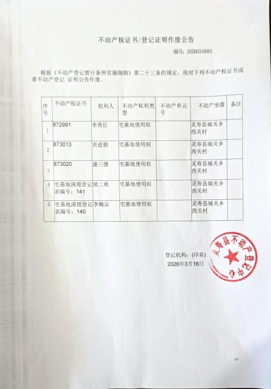 不动产权证书/登记证明作废公告编号:20260316001