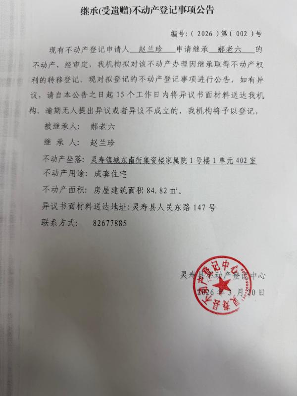 关于编号:(2026)第(002)号继承(受遗赠)不动产登记事项公告